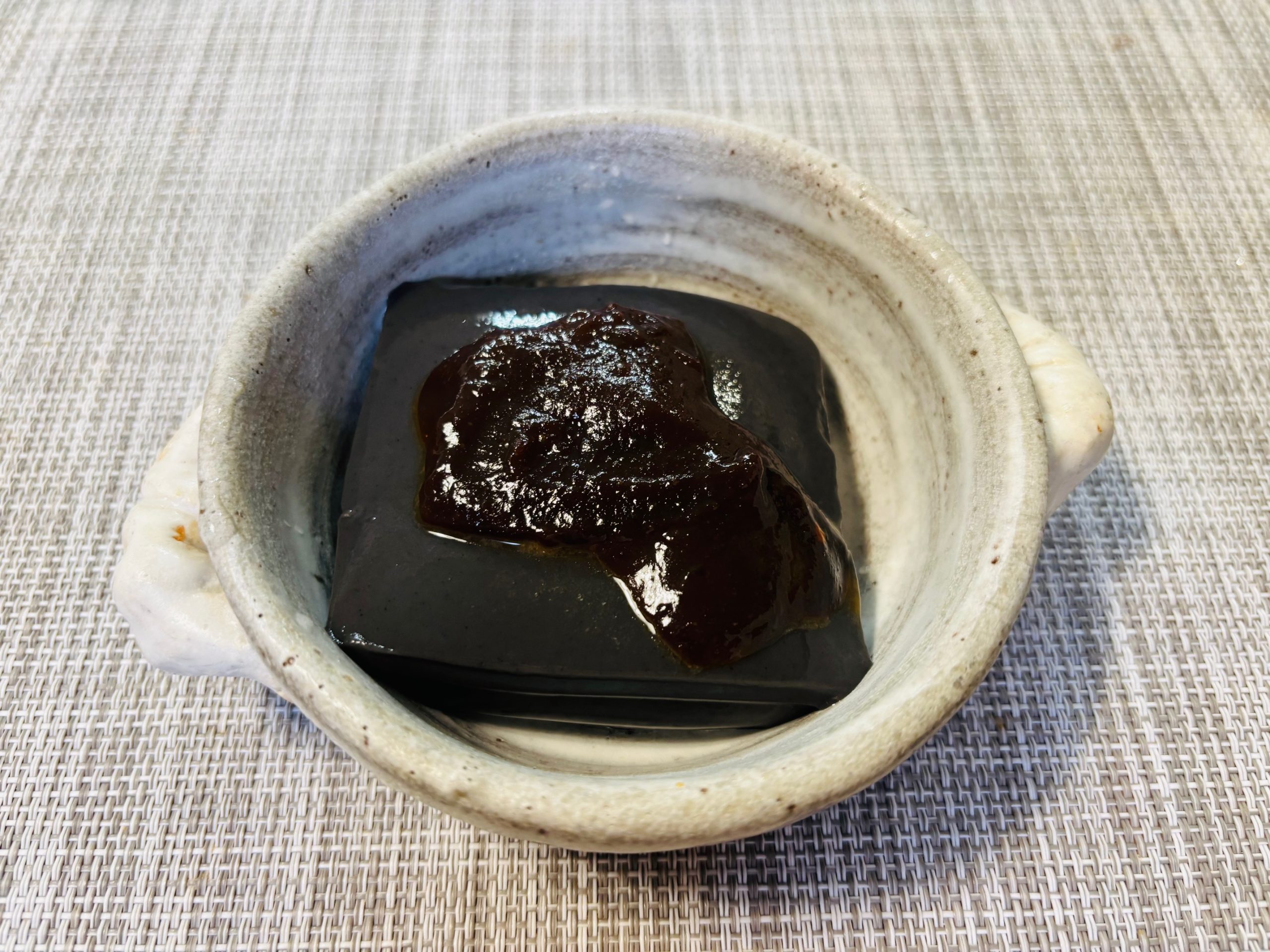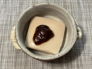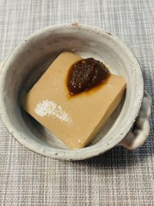高野山のごま道具はワサビとお醤油でいただくのに対し、永平寺のごま豆腐はみそだれでいただくのが一般的です。