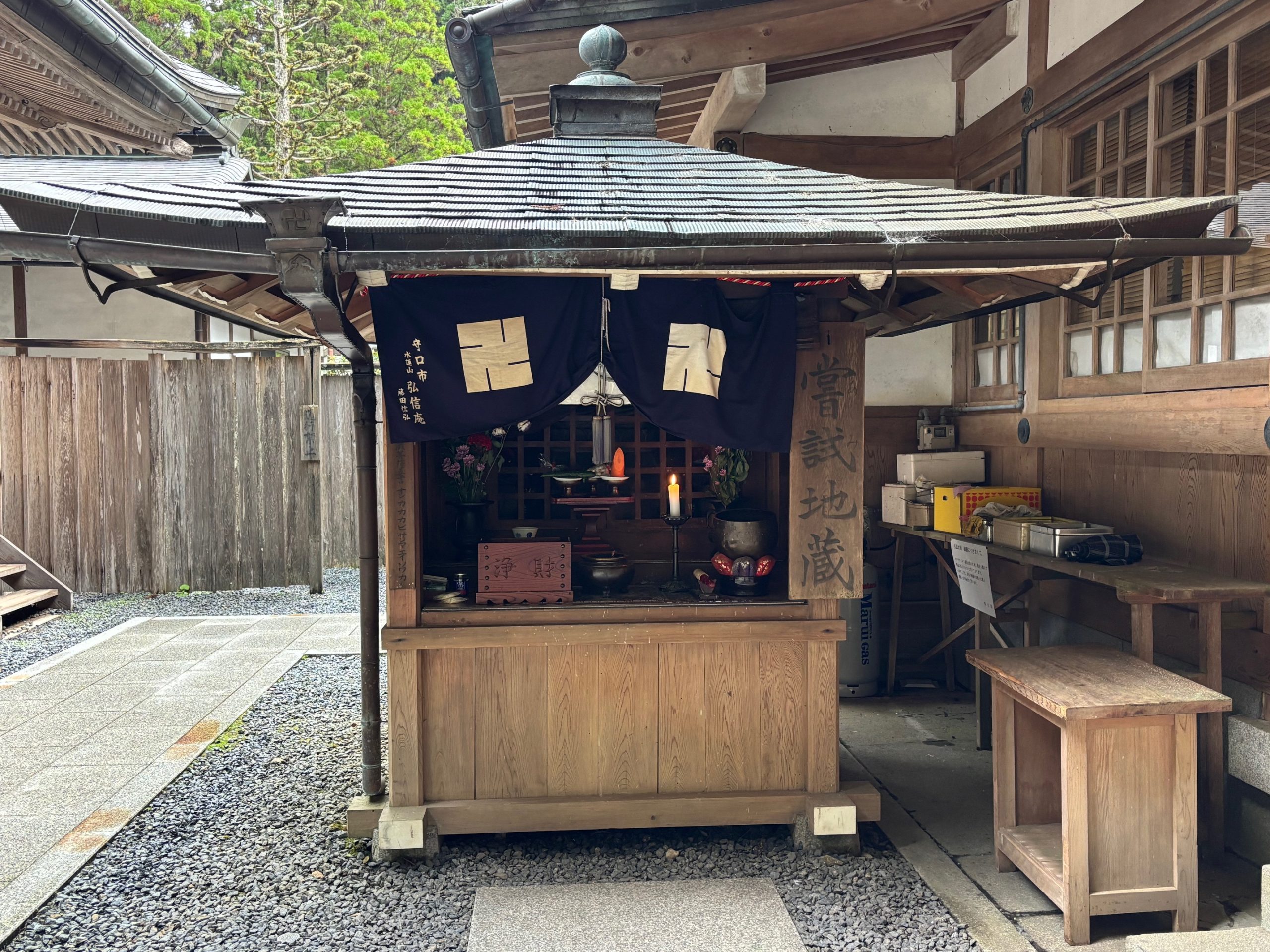 御供所で調理したお大師さまへのお食事(=生身供:しょうじんく)をこの嘗試地蔵(あじみじぞう)さまに味見していただいた後、1日2回(6:00と10:30)御廟へ運びます。