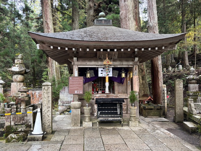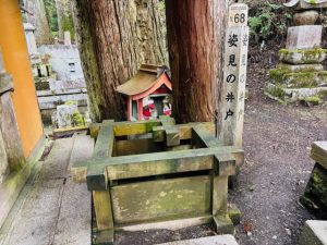 奥之院 一の橋から御廟へ向かう参道を歩いて10分ほど、中の橋を渡ってすぐ左手にある「汗かき地蔵」とその隣の「姿見の井戸」。