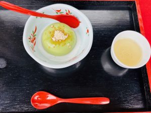 京都の一保堂茶舗の抹茶を使用して作られたほろ苦い抹茶胡麻豆腐と、和三盆の上品で優しい甘さがとても良いバランス♪