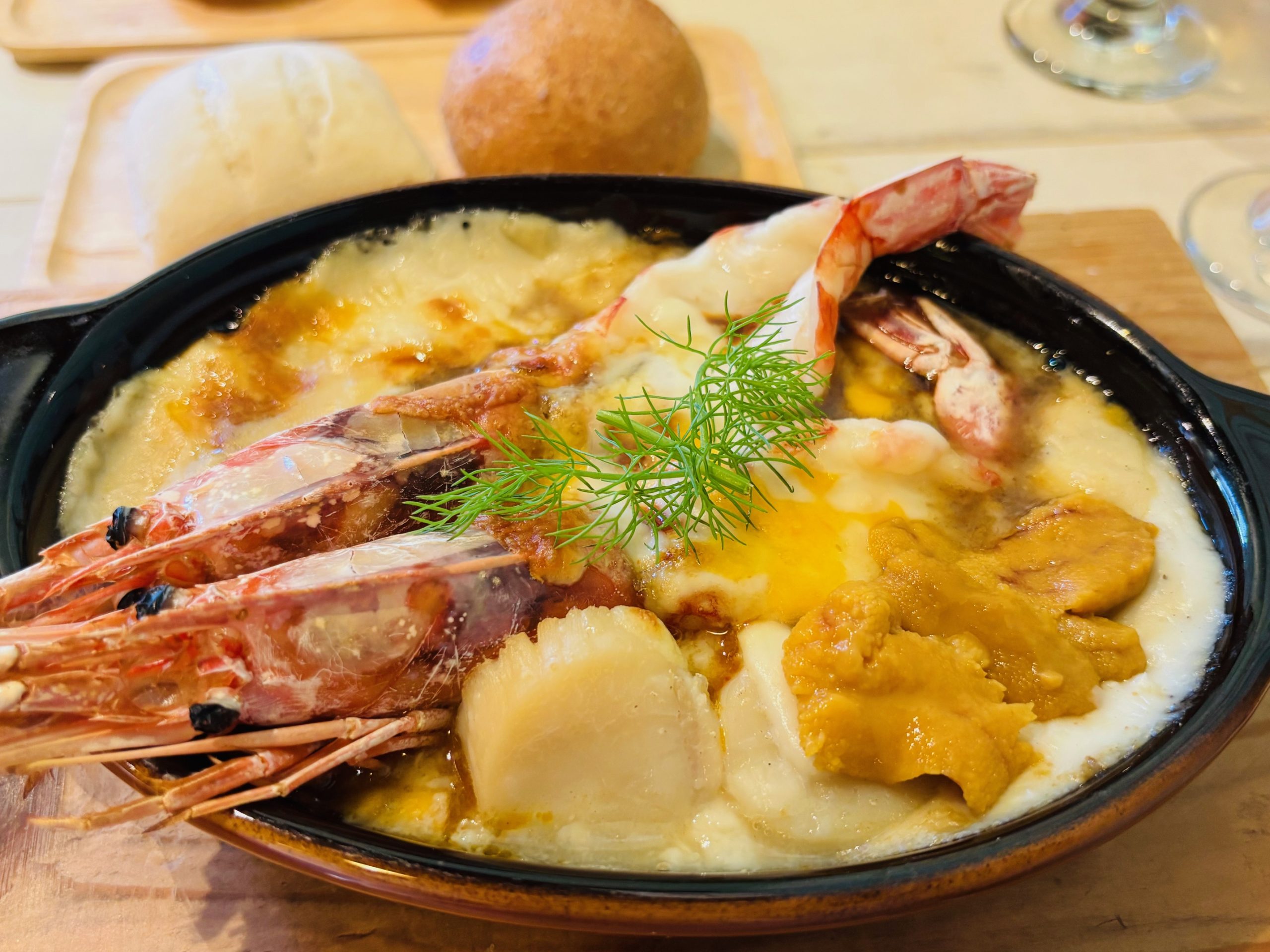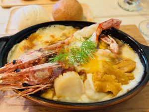 アツアツのグラタン、食べるところによってエビ味噌、ウニ、ホタテと贅沢な海の幸を味わうことができました😊
