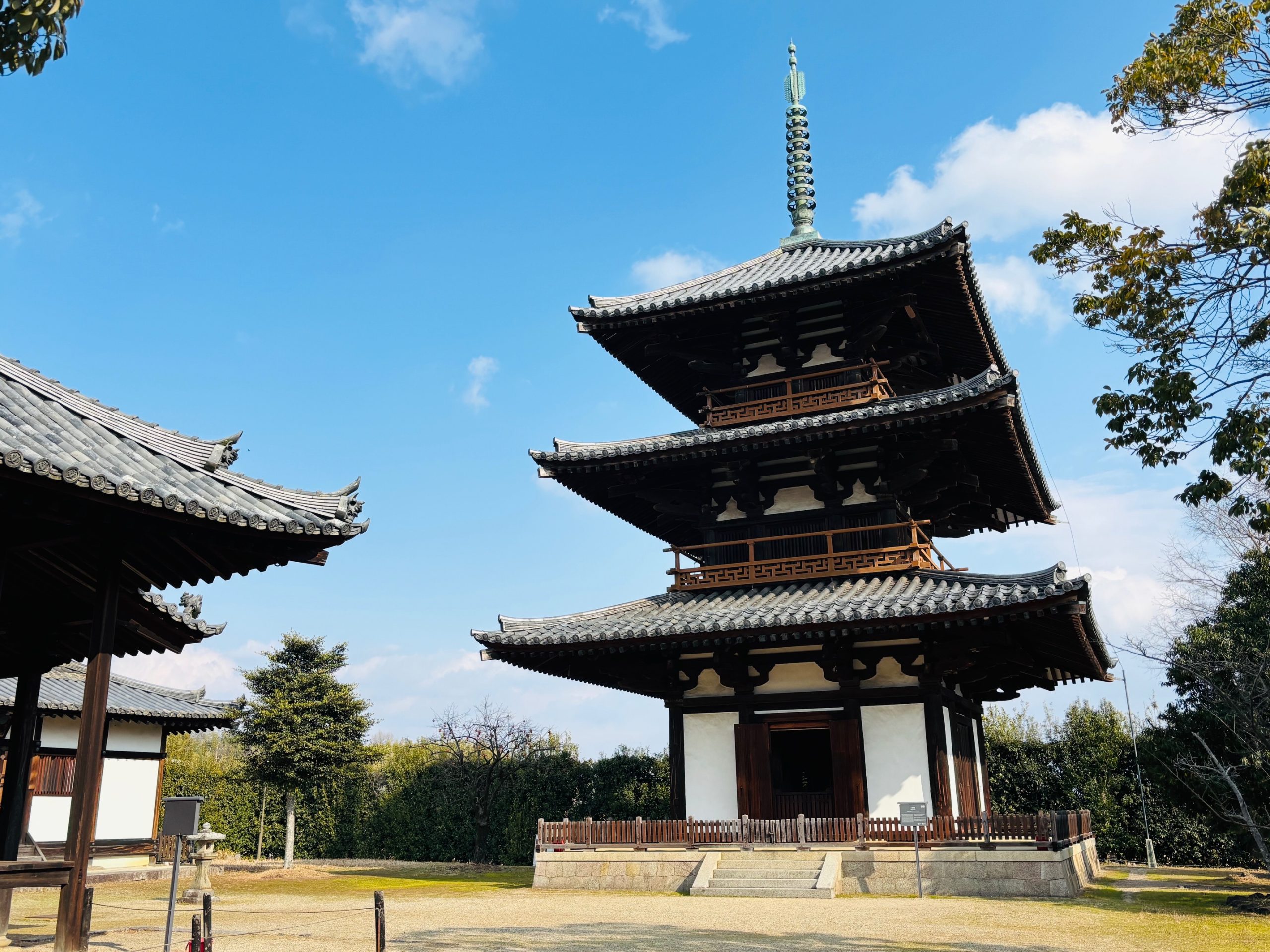 法隆寺五重塔の建築様式と密接な関係があり、この三重塔は法隆寺五重塔にならって建立されたのだとか。