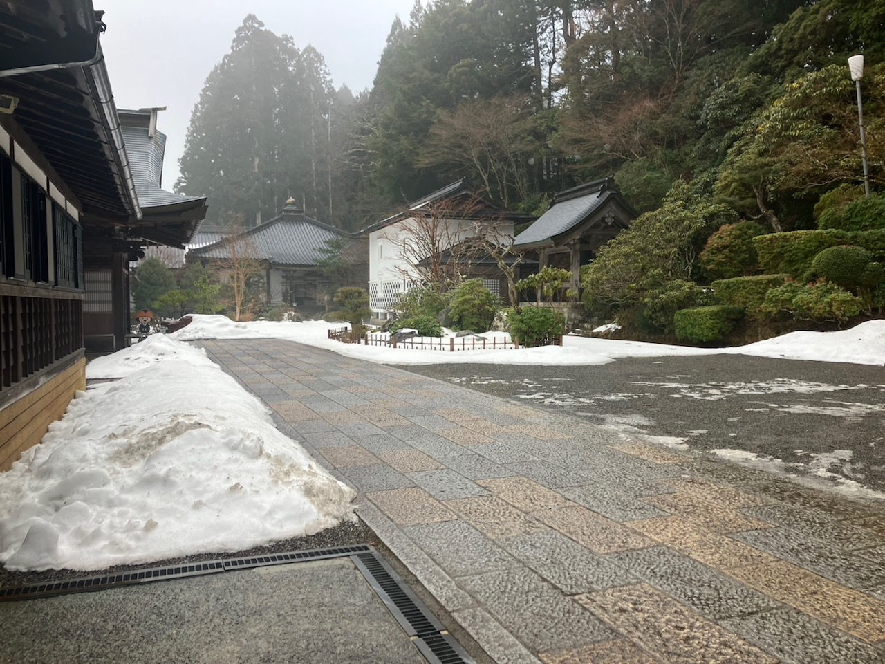 持明院のお庭、仏舎利宝塔共に歩くところは雪はありませんが、一部雪が残っているところも見られます。