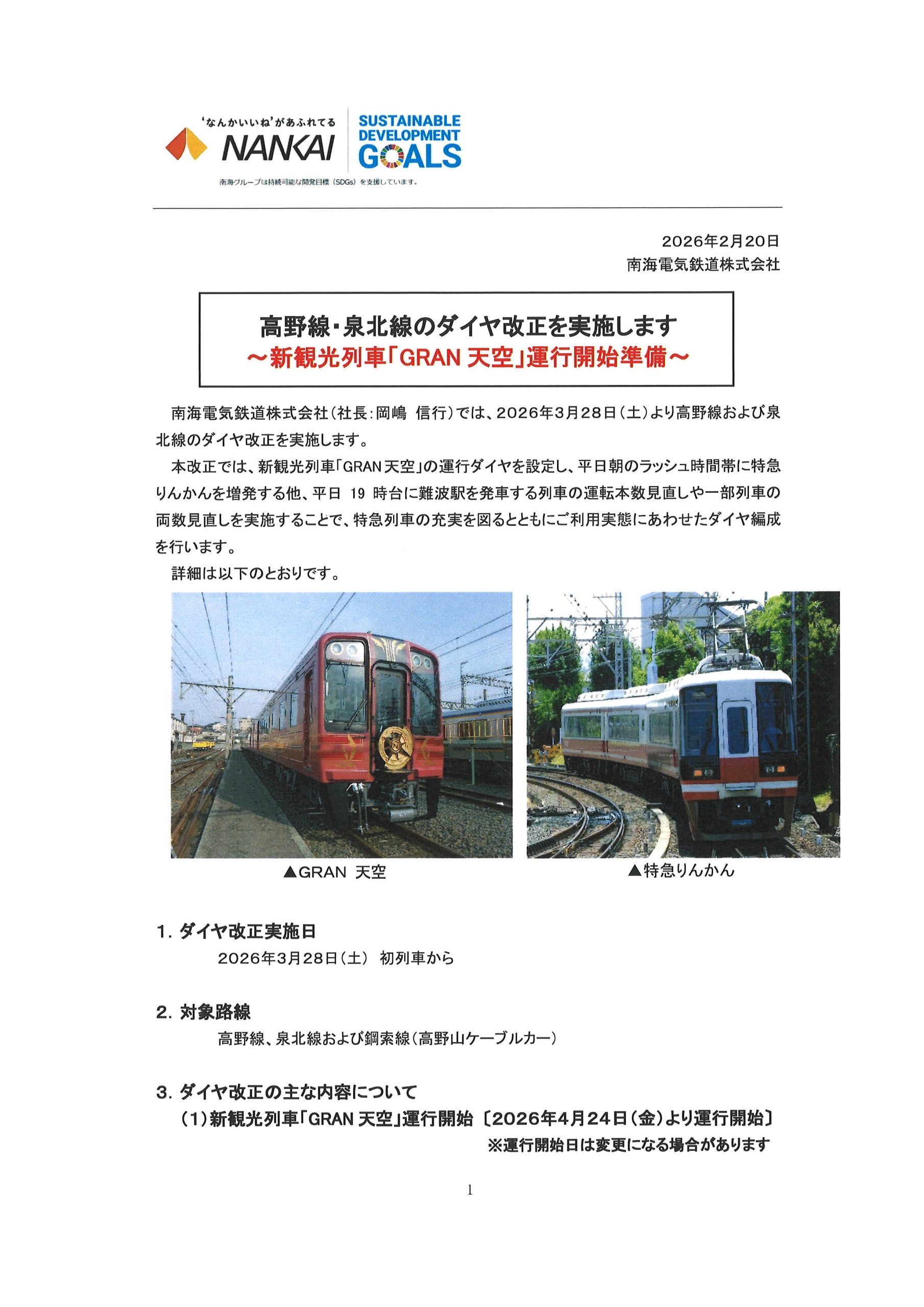 南海電鉄高野線が2026年3月28日(土)よりダイヤ改正されます。