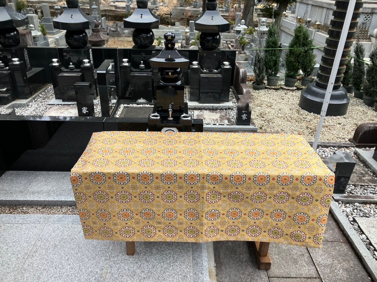 はすの会会報最新号 No.71 でもご紹介したとおり、この度 仏舎利宝塔内礼拝室の焼香台の敷物と地上墓納骨法要の際に使用する掛物を新調しました。